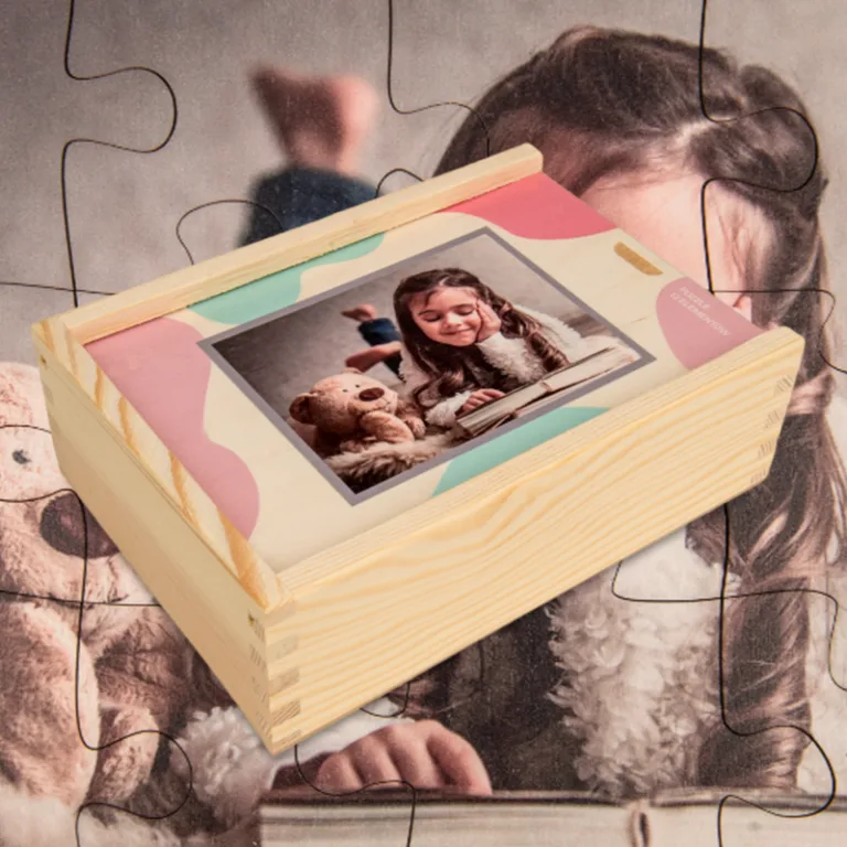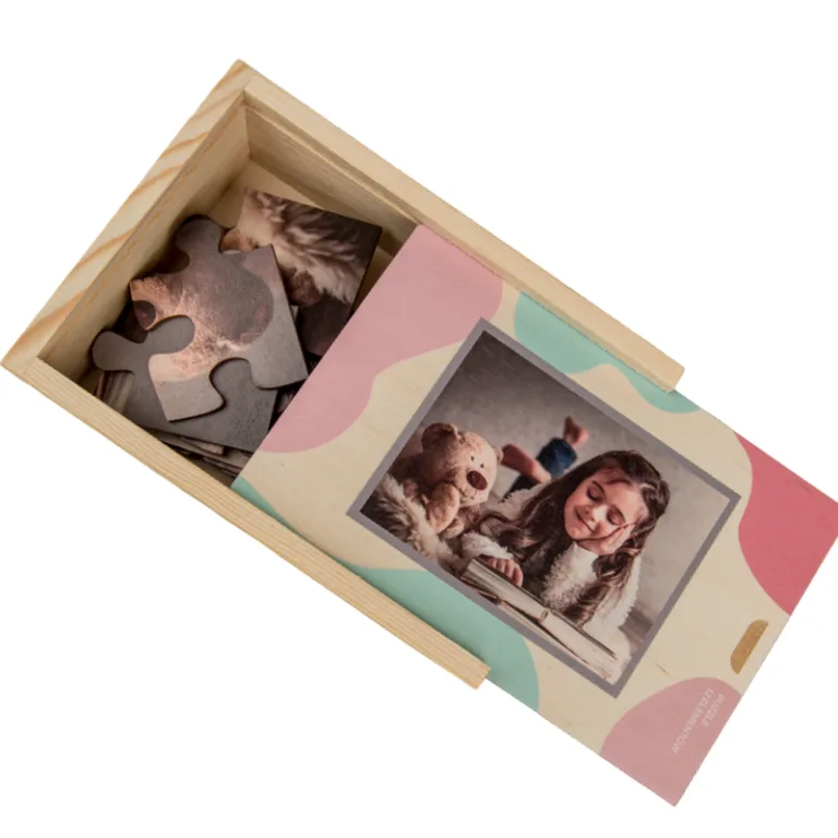 Nasze fotopuzzle to nie tylko zwykła zabawka. To małe dzieło sztuki, stworzone z pasją i dbałością o każdy szczegół. Wykonane z wysokiej jakości drewna, puzzle są solidne i trwałe, a nadrukowane na nich zdjęcie zachwyca żywymi kolorami i wyraźnymi detalami. Puzzle są zapakowane w eleganckie drewniane pudełko z wysuwaną górą częścią, która również jest personalizowana Twoim projektem! Całość prezentuje się elegancko i stylowo, przez co idealnie sprawdzi się jako prezent.